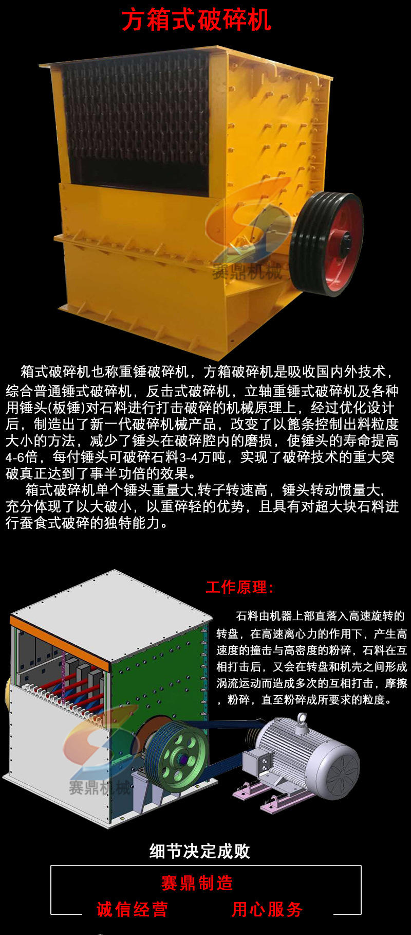 方箱式破碎機也稱方箱破碎機,是吸收國內(nèi)外先進技術(shù),綜合普通重錘式破碎機、反擊式破碎機、立軸重錘式破碎機及各種用錘頭(板錘)對石料進行打擊破碎的機械 原理上,經(jīng)過優(yōu)化設(shè)計后,制造生產(chǎn)出了新一代破碎機械產(chǎn)品,改變了以篦條控制出料顆粒大 小的方法,減少了錘頭在破碎腔內(nèi)的磨損,使錘頭的壽命提高4—6倍,每付錘頭可破碎石料3—4萬噸,實現(xiàn)了破碎技術(shù)的重大突破,達到了事半功倍的效果。 方箱式破碎機的應(yīng)用范圍:礦山、石料場、石子場 方箱式破碎機的應(yīng)用物料:石灰石、花崗巖、頁巖、風(fēng)化巖、珍珠巖、河卵石等各種礦石料。